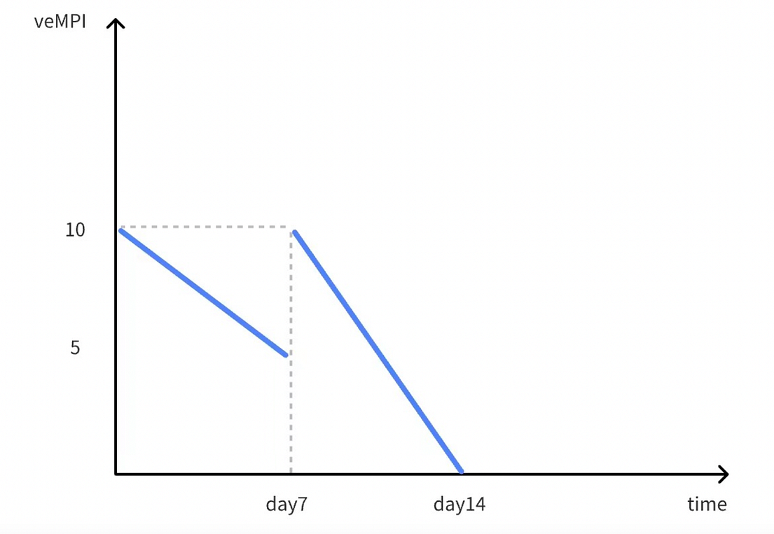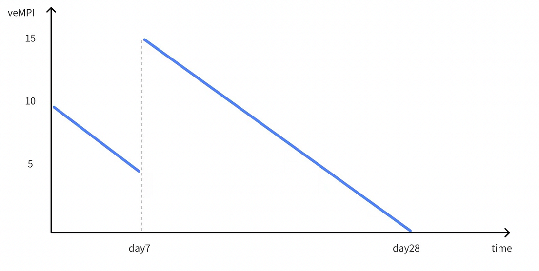 For example: $MPI staking amount= 526.3 MPI , your initial number of veMPI = 10; staking time = 2 weeks, on the 7th day you extended the staking time by 2 more weeks; your veMPI amount changes as follows