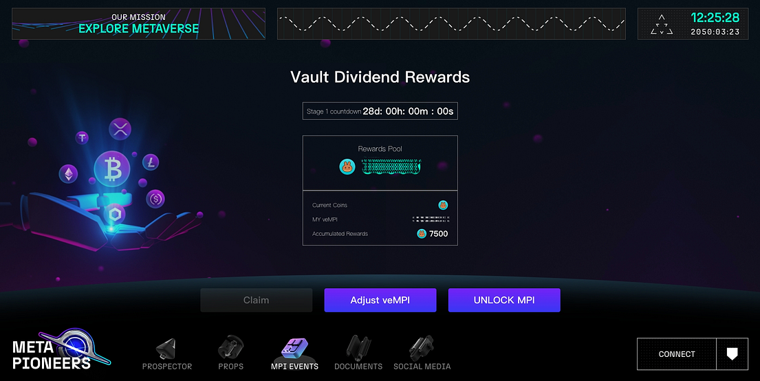 $MPI holders can stake their $MPI tokens to Metapioneers DApp to receive veMPI. The longer you stake, the more veMPI you get. The vault will take out a part of the fixed cycle income as a dividend reward, and the system will check it every week to calculate the reward share according to the real-time proportion of the user’s veMPI.